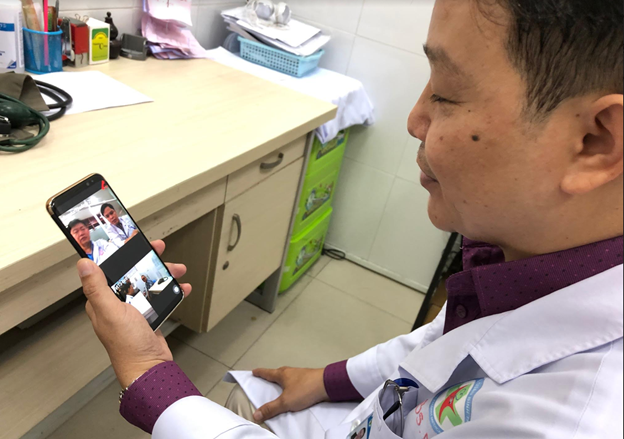 | BS TRạm y tế phường 13 trao đổi trực tuyến qua điện thoại hổi chẩn với BS Nhi Đồng 2 về trường hợp bệnh nhi. |