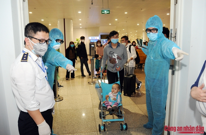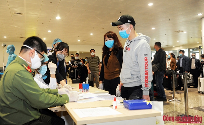 Để làm thủ tục cần thiết khi nhập cảnh các cán bộ, chiến sỹ (CBCS) “tuyến đầu” Công an Cửa khẩu Cảng hàng không quốc tế Nội Bài (Công an CKCHKQT Nội Bài) đã phối hợp với các đơn vị Kiểm dịch y tế, Hải quan, nhân viên của các hãng hàng không... hướng dẫn , phân luồng khách để khai báo y tế, lấy mẫu xét nghiệm, phục vụ đồ ăn nước uống, lấy đồ ký gửi từ khu vực hành lý .... cũng như tổ chức cách ly cho gần 1.000 người Việt Nam quá cảnh qua các chuyến bay của các hãng hàng không nước ngoài về tránh dịch...