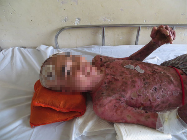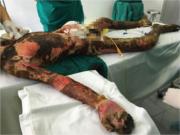 Được biết, BN được đưa vào Trung tâm Y tế huyện Trảng Bàng sơ cứu, sau đó chuyển tới BV Chợ Rẫy điều trị. Kết quả chẩn đoán, BN bỏng lửa xăng diện tích 82% độ II, III, IV (bỏng sâu 60 % độ III, IV) toàn thân.