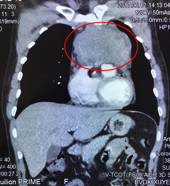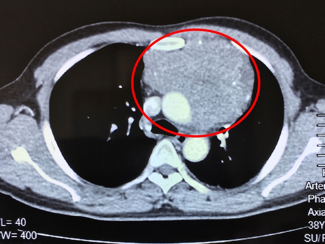 Sau khi thăm khám, các bác sĩ xác định có 1 khối u xuất phát từ trung thất trước, xâm lấn rộng vào màng ngoài tim, tĩnh mạch vô danh, thần kinh hoành bên trái, động mạch phổi và lan ra sau dính vào động mạch chủ ngực xuống.