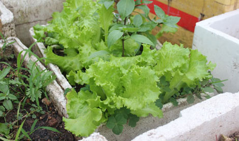 | Trên sân thượng, bác sĩ Hùng tự trồng rau vào thùng xốp. Ảnh: Bác sĩ cung cấp. |