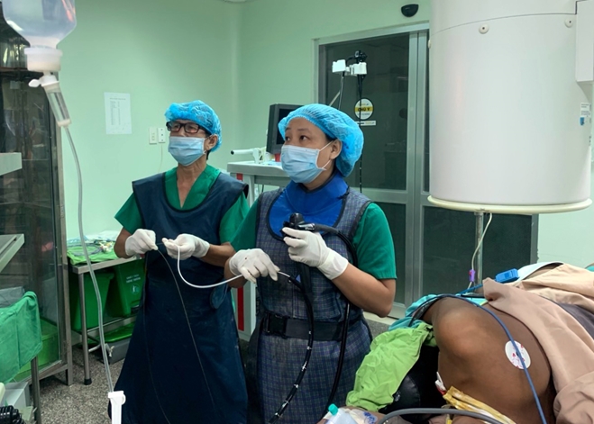 | Ê kíp can thiệp nội soi dẫn lưu dịch. |