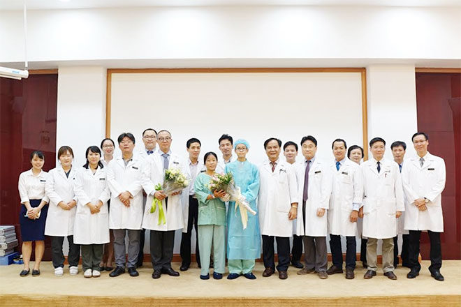 | Kíp phẫu thuật ghép gan chúc mừng hai mẹ con chị Huyền – cháu Toàn trong ngày xuất viện. |