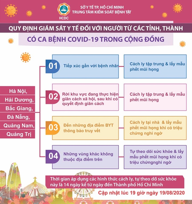 Ngày 20/8, theo Trung tâm Kiểm soát bệnh tật TP Hồ Chí Minh (HCDC), thành phố bắt đầu triển khai thực hiện giám sát y tế đối với người từ 6 tỉnh, thành phố đang có trường hợp mắc COVID-19 hoặc đang thực hiện giãn cách xã hội, gồm: Hà Nội, Hải Dương, Bắc Giang, Đà Nẵng, Quảng Nam, Quảng Trị. Các vùng có dịch sẽ được cập nhật tuỳ theo diễn biến dịch bệnh COVID-19.