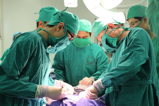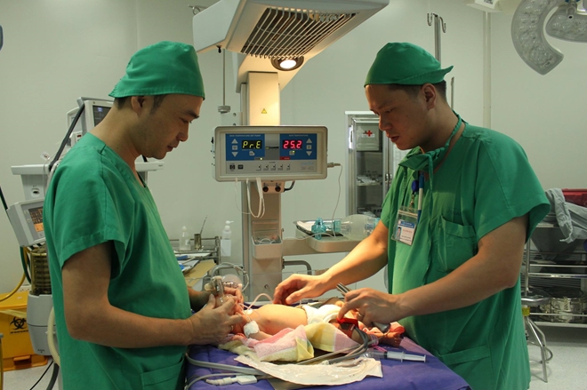Ca phẫu thuật đã diễn ra trong hơn 1 tiếng đồng hồ, do BS. Nguyễn Quốc Hùng – Giám đốc BV và BS. Bùi Hải Nam trực tiếp thực hiện. Do bệnh nhân còn quá bé, phẫu trường rất nhỏ, khó thao tác nhưngvới kinh nghiệm đã có, các bác sĩ đã cắt bỏ toàn bộ phần nang phổi bẩm sinh cho bé thành công.