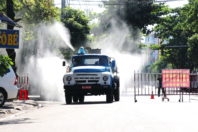 Theo đó, hai xe chuyên dụng tiến hành phun Cloramin 70% tại những khu vực đang cách ly, phong tỏa và những địa điểm công công là bến xe, ga xe lửa..