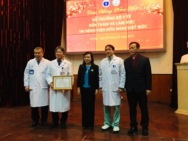 Ghi nhận thành tích của BV Việt Đức trong kỹ thuật ghép đa tạng, đặc biệt là ca ghép phổi lần đầu tiên được 100% các chuyên gia Việt Nam tiến hành, Bộ trưởng Y tế Nguyễn Thị Kim Tiến đã tặng Bằng khen cho tập thể BV Việt Đức.
