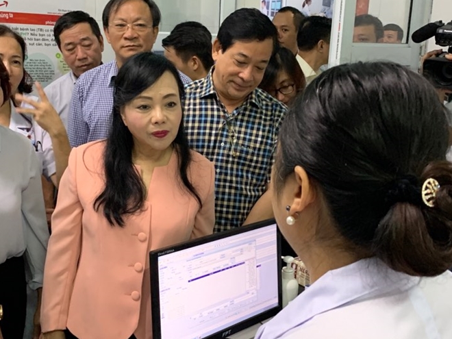 | Bộ trưởng Nguyễn Thị Kim Tiến nghe nhân viên y tế báo cáo việc áp dụng công nghệ thông tin trong việc quản lý hồ sơ bệnh nhân. |