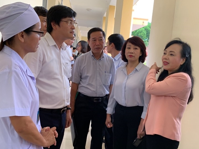 | Bộ trưởng Nguyễn Thị Kim Tiến; bà Vũ Thị Thu Thủy, Phó Chủ tịch UBND tỉnh Quảng Ninh kiểm tra công tác khám bệnh tại Trạm Y tế xã Đoàn Kết . |