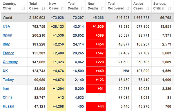 Trong 24 giờ qua, thế giới ghi nhận thêm gần 74 ngàn ca bệnh và hơn 5 ngàn ca tử vong mới. Như vậy, trên toàn thế giới hiện đã có tổng cộng gần 2,5 triệu ca bệnh và hơn 170 ngàn ca tử vong.