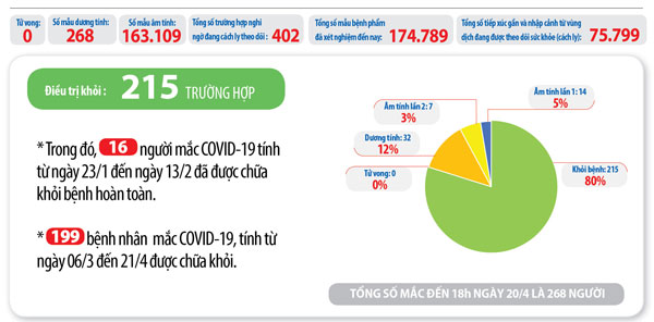 Như vậy, số ca bệnh ở Việt Nam hiện vẫn đang dừng lại ở con số 268 trường hợp, trong đó có 214 người khỏi bệnh, chỉ còn 54 người đang cách ly, điều trị tại 9 cơ sở y tế và tổng số người đang cách ly cũng đã giảm.