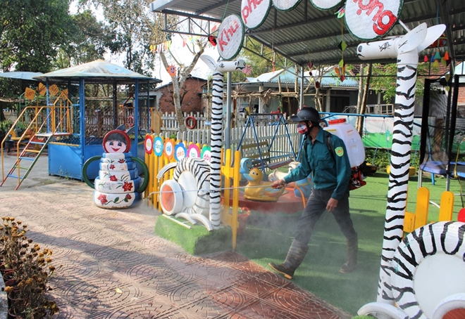 Sáng ngày 5-2, Trường Mẫu giáo Ánh Dương (thị trấn Phú Thịnh, huyện Phú Ninh, tỉnh Quảng Nam) phối hợp với chính quyền địa phương khẩn trương phun hóa chất tiêu độc khử trùng và triển khai công tác phòng chống dịch trong nhà trường.