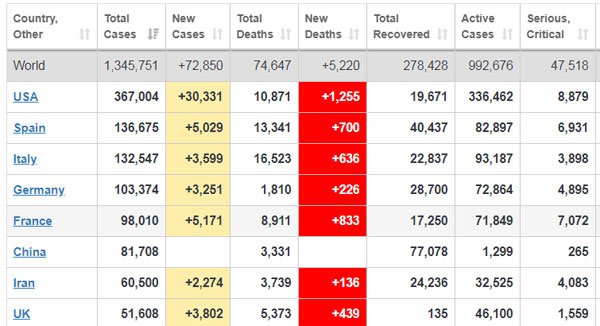 Trên thế giới, trong 24 giờ qua ghi nhận thêm 72.850 ca mắc mới và 5.220 ca tử vong mới, nâng tổng số lên 1.345.751 ca bệnh và 74.647 ca tử vong. Số ca bệnh mới trên thế giới vẫn chưa “hạ nhiệt” khi ở các ổ dịch tại Mỹ và châu Âu đều ghi nhận số ca bệnh mới tăng nhẹ so với ngày hôm qua.